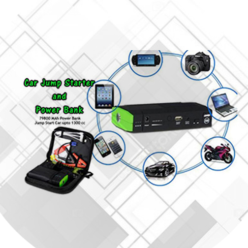 Powerful power bank battery upto 79,800 MAH battery with car jump starter, laptop charger backup, mobile power bank and more. Start cars upto 1300 cc, charge various volatage and laptop pins, mobile charging cables, car batter terminal and other accessrioes. Must for every car with long run and route. Charge your laptop anywhere.